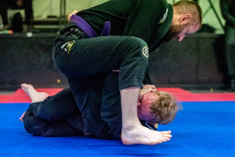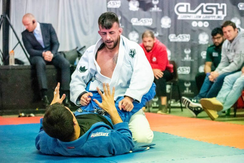 Dan T threatening his opponent early on in the match with a lapel choke.