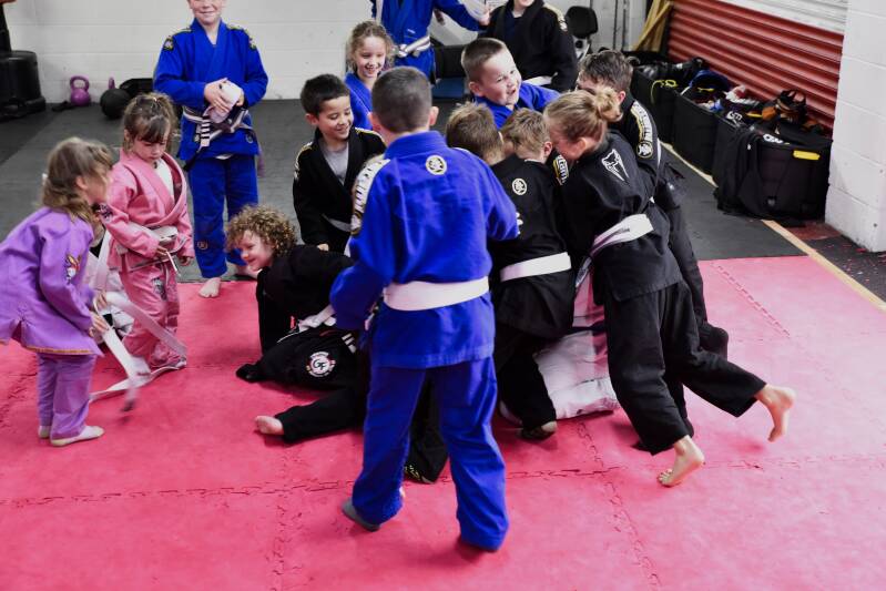 Its customary at Gamefight Wakefield that at the end of the kids seminar all students beat up coach Dan. (He's somewhere in there :) )
