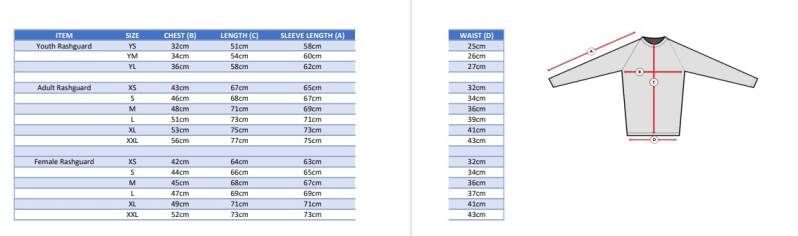 Below are size guides for rashguards and T-Shirts. The hoodies are standard fittimg and so are the spats. Its best to go with the size you normall are with these products. For example if you are as large fitting in the T shirt and rash guard then go with this for the hoodies, spats and shorts. The T Shirts are a tight fit, so if a looserfit is preffered its recommended to go for the next size above.